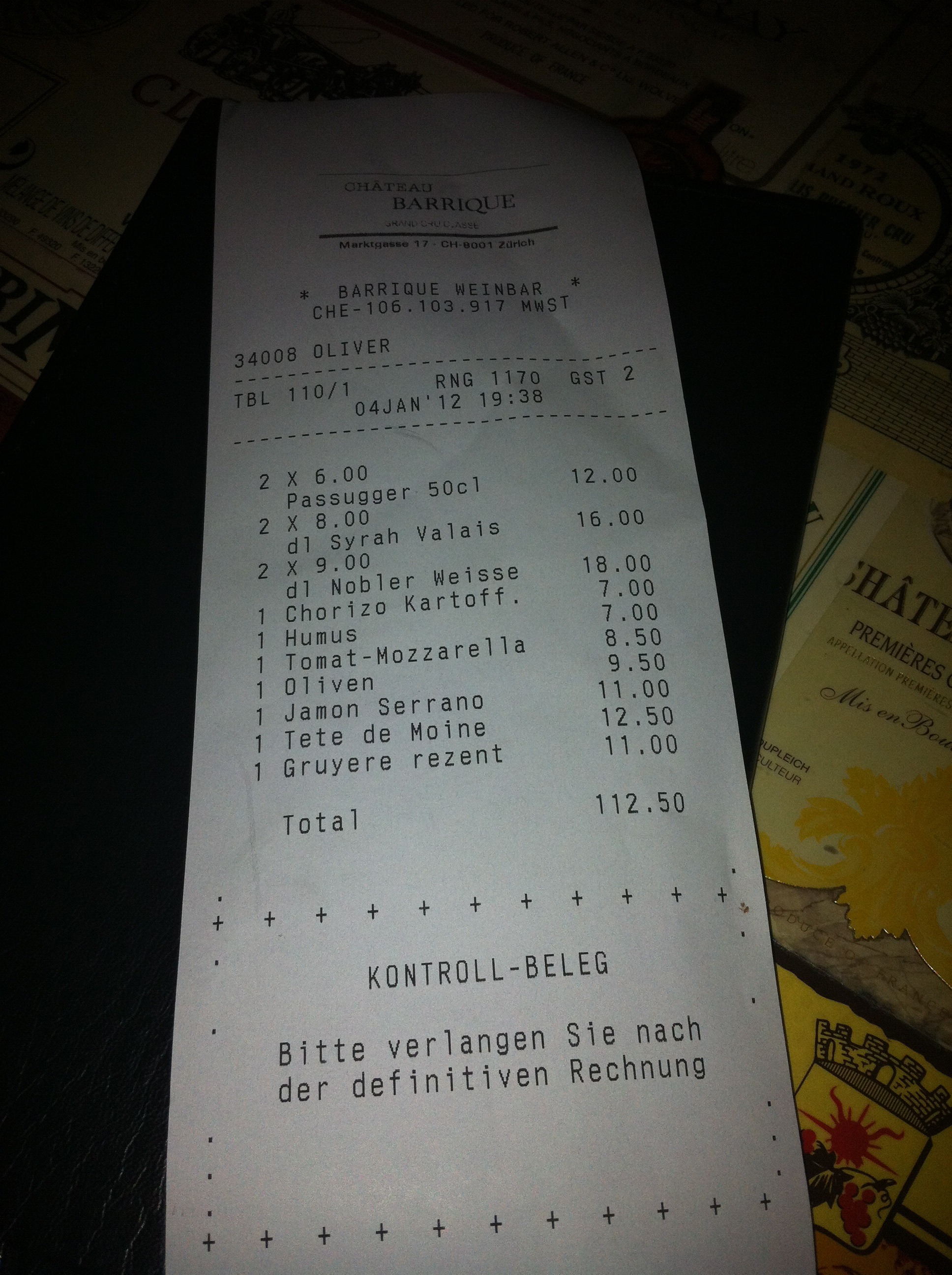 Autsch, das war gesalzen! Und wir haben noch nicht mal richtig zugelangt. Für einen grossen Teller Tapas, vier Gläser Wein und eine Flasche Wasser haben wir erstaunliche 112.50 Franken bezahlt.