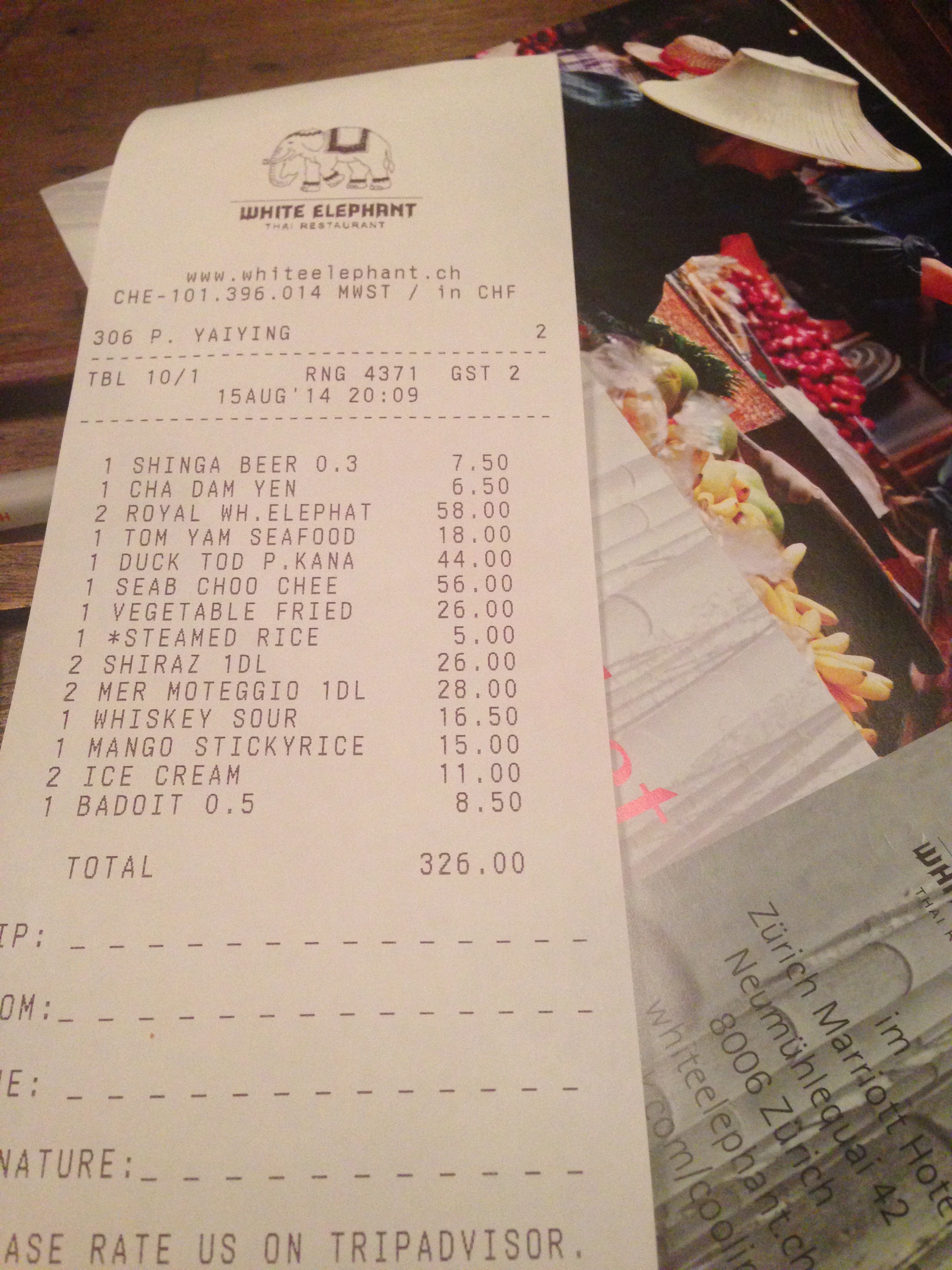 Auch die Preise heben sich vom durchschnittlichen Thai-Restaurant ab. Ein Curry mit Rindfleisch steht beispielsweise für 47 Franken auf der Karte, wobei die Qualität mit dem relativ hohen Preis ohne Frage mithält. Bei unserem Besuch wollten wir so viele der Gerichte wie möglich probieren und haben uns nicht zurückgehalten. Zu zweit haben wir für ein ausführliches Essen mit genügend Getränken 326 Franken bezahlt.
