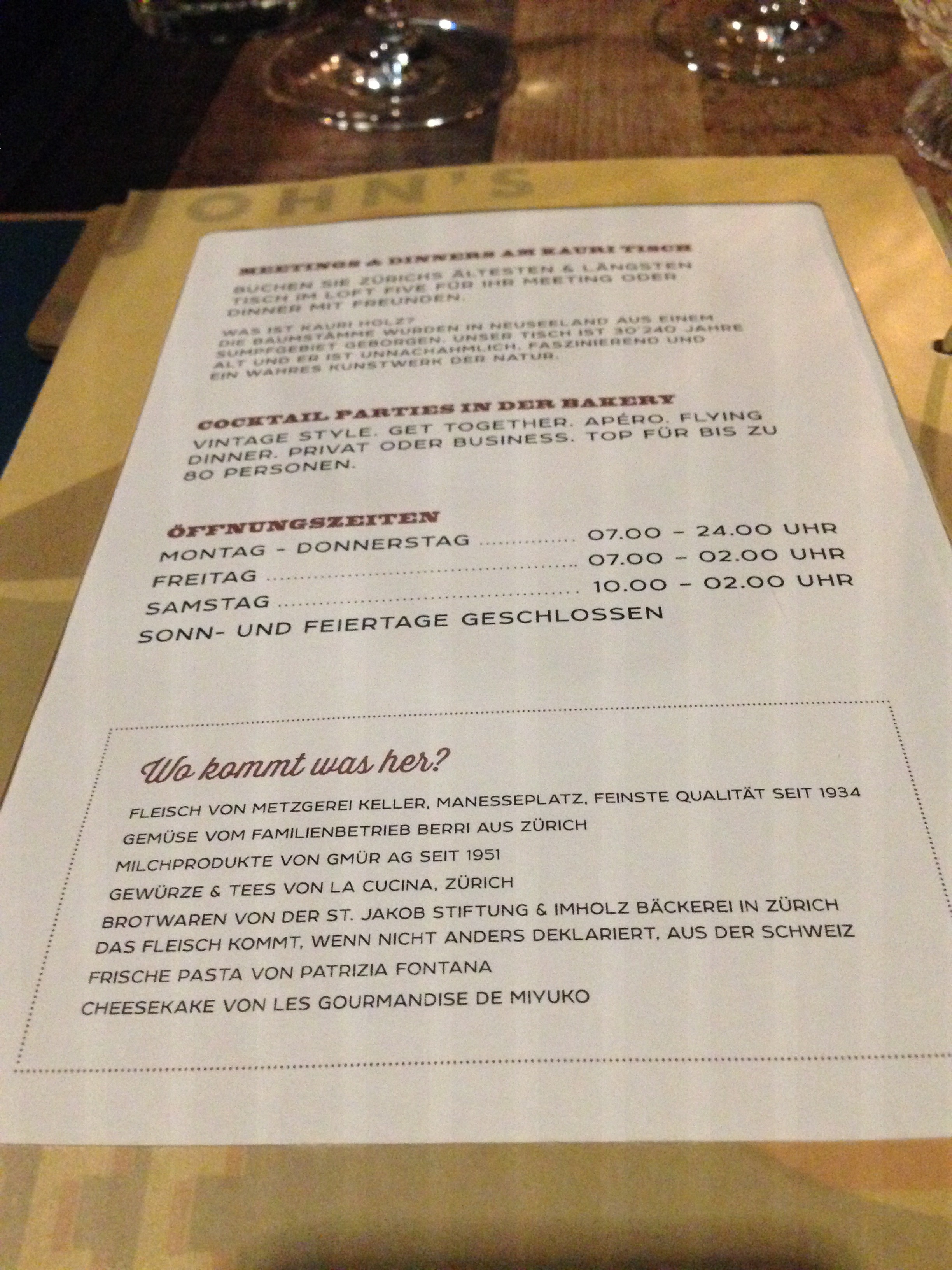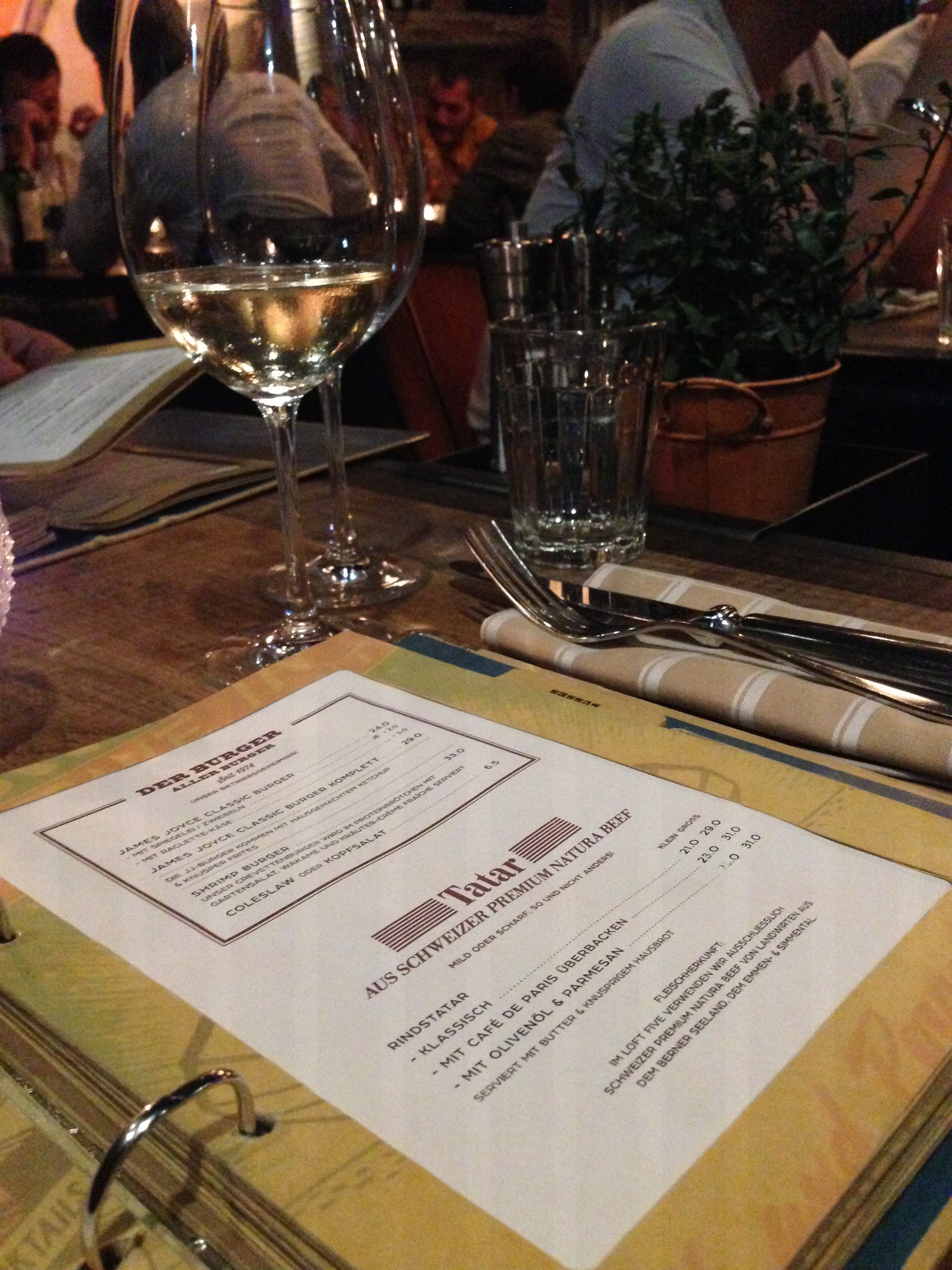 Das Angebot ist auf den Charakter des Restaurants abgestimmt. Die Loft Five Macher betiteln es als „Upper Class Casual Dining“, was in unseren Ohren zwar etwas gestelzt klingt, aber rein von der Beschreibung her gut passt: Fish’n’Chips, Burger, Salade Niçoise, aber auch Entrcôte und geschmorte Lammhaxe mit Tessiner Polenta. Speziell zu erwähnen: Wenn immer möglich verwendet die Küche regionale Produkte. Als Fans der Metzgerei Keller am Manesseplatz (sicher eine der besten Metzgereien in Zürich) freuen wir uns natürlich um so mehr, dass das Loft Five sein Fleisch von dort bezieht.