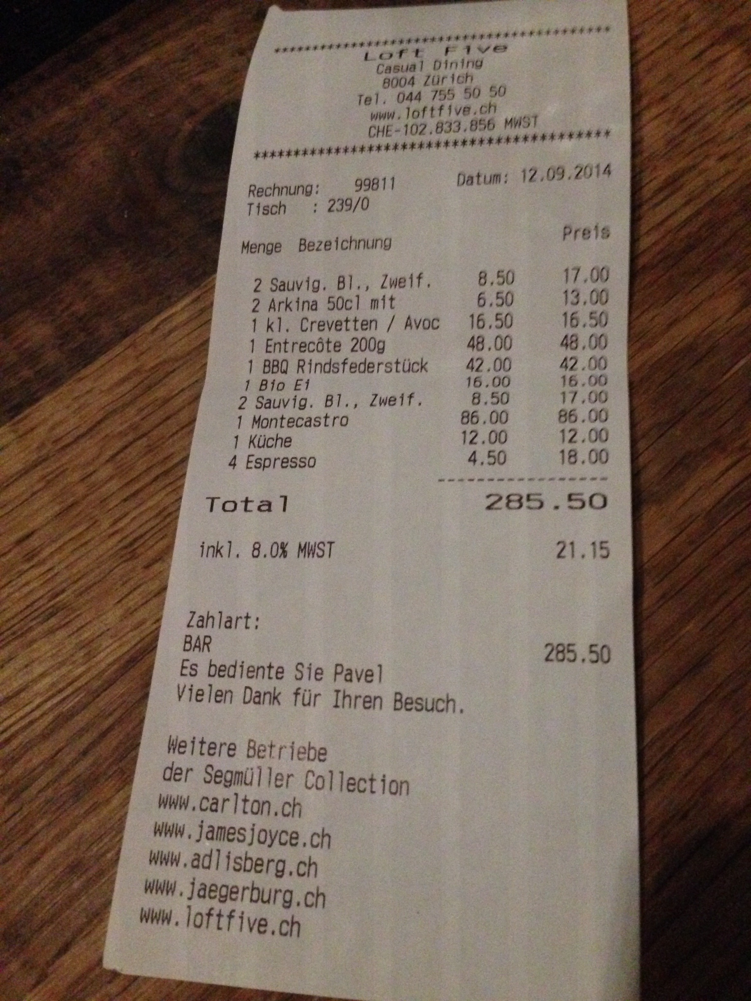 Wir waren positiv überrascht! Für die Grösse und den „Coolness-Faktor“ des Lokals war der Service sehr freundlich und persönlich. Damit setzt sich das Loft Five von vielen anderen Zürcher Restaurants ab. Bleibt zu hoffen, dass das Niveau auch langfristig gehalten werden kann.