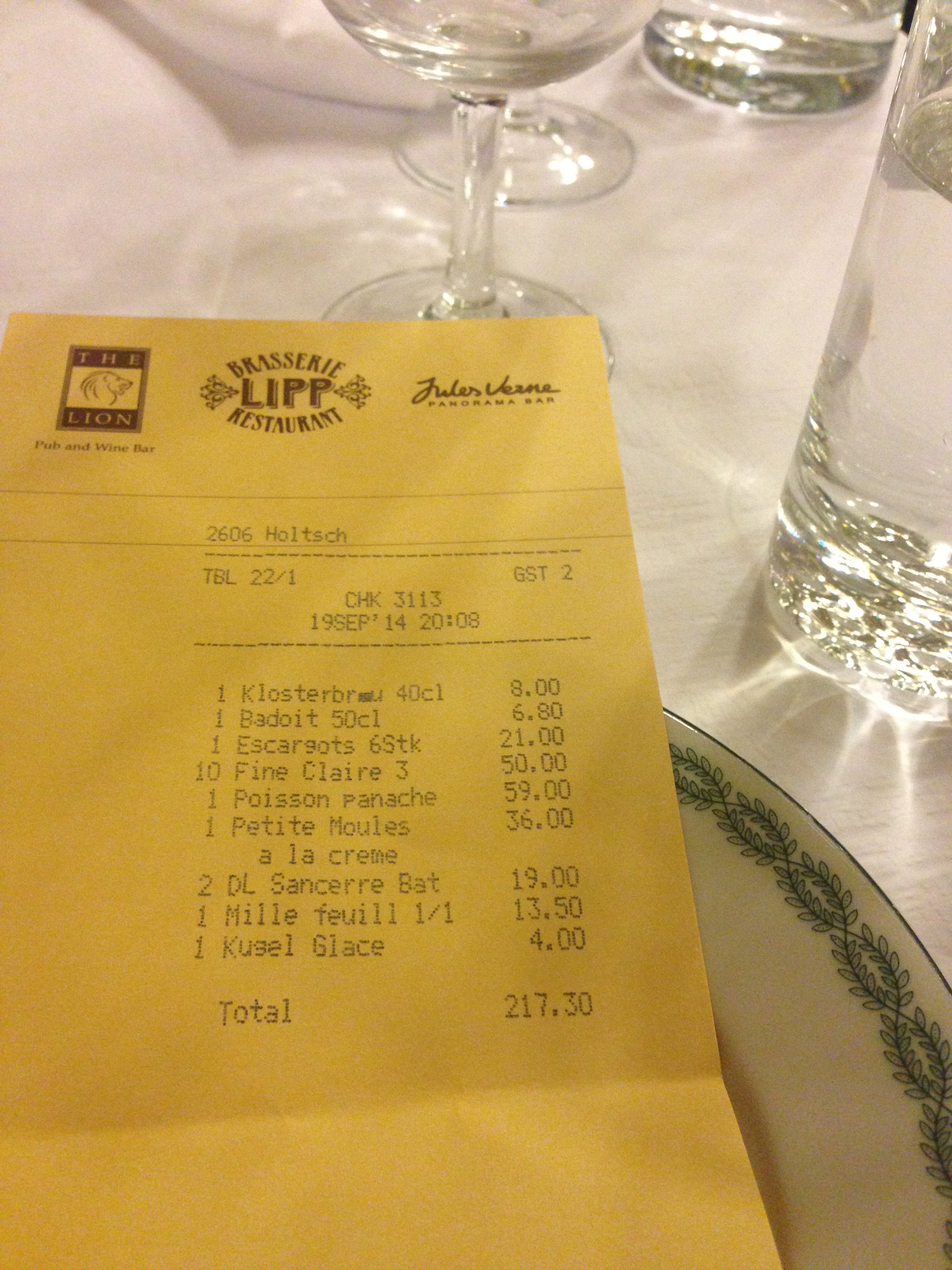 Bei unserem letzten Besuch allerdings waren wir dann doch nicht hundertprozentig zufrieden. Der Fisch von der Fischplatte war arg trocken und die Auswahl an Meeresfrüchten eher bescheiden. Das mag vielleicht an der Jahreszeit liegen, Mitte September ist wohl noch etwas früh. Dem Versprechen „La Mer chez Lipp“ wurde die Brasserie dieses mal leider nicht voll gerecht. Wir werden es bei Gelegenheit wieder prüfen.