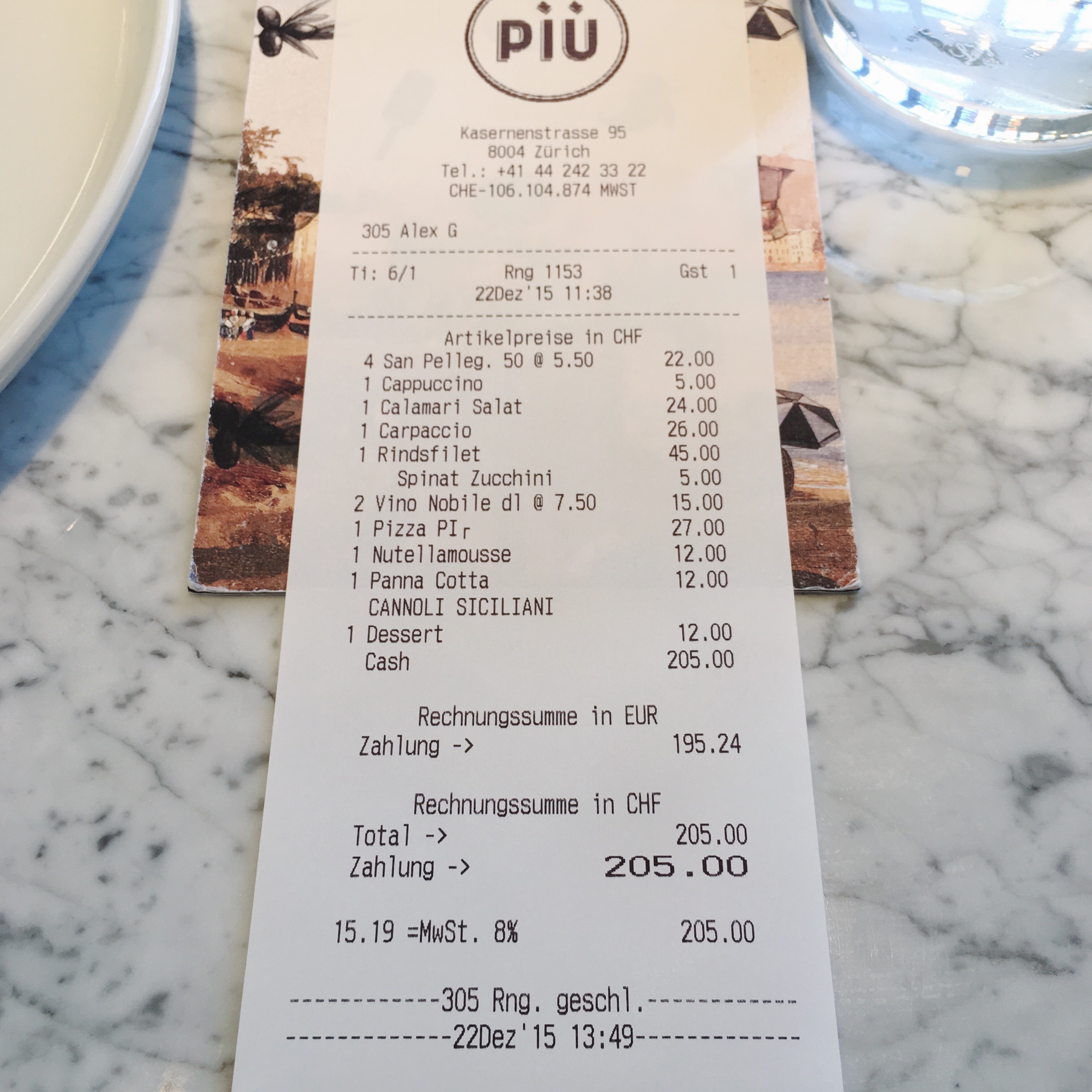 Die Preise sind ganz in Ordnung, wenn auch eher am oberen Rand. Antipasti kosten zwischen 9 und 19 Franken (für 9 Franken gibt es eine Linsensuppe mit Parmaschinken, für 19 Franken ein Rindscarpaccio), Hauptgänge bekommt man ab 26 Franken (Perlhunbrust). Pizzas gib es ab 16 Franken für die Marinara, was hingegen sehr günstig ist.